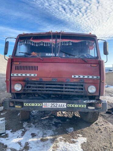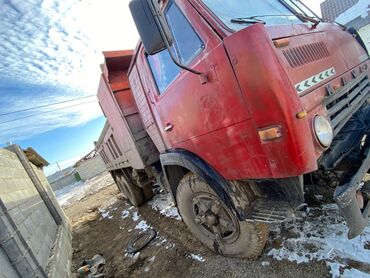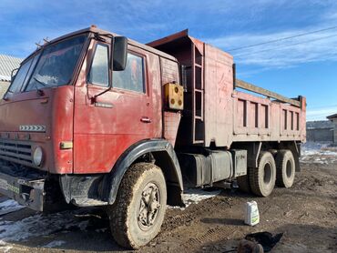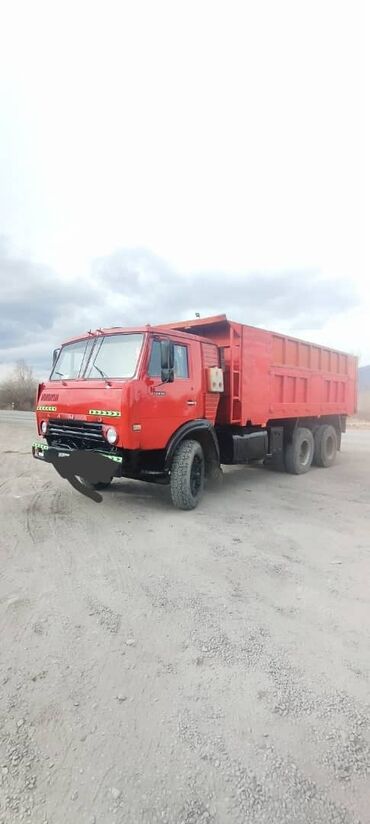 КАМАЗ самосвал, трехосный (6x4). Красный металлический кузов увеличенного объема с высокими бортами, гидроподъем платформы для разгрузки сзади. Кабина цельнометаллическая, круглая оптика, внешние зеркала на длинных кронштейнах. Усиленный передний бампер с дополнительными световыми элементами и сигнальной светоотражающей разметкой по периметру. Колесная формула с двумя ведущими задними мостами, двускатные задние колеса. Топливный бак сбоку рамы, подножки для удобной посадки. Подходит для перевозки сыпучих материалов: щебень, песок, грунт, строительный мусор. Надежное шасси КАМАЗ, рассчитанное на работу на грунтовых дорогах и в карьерах.