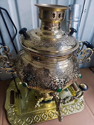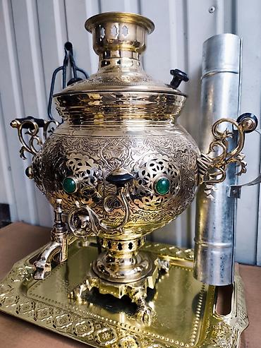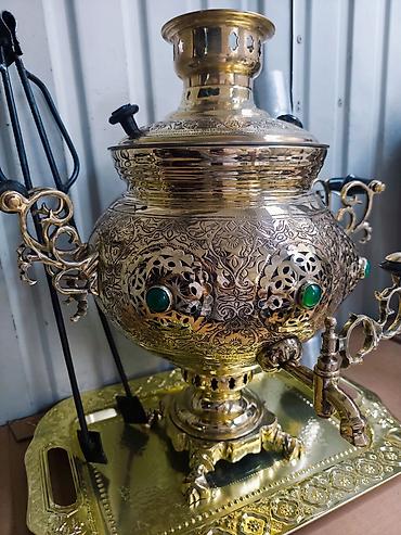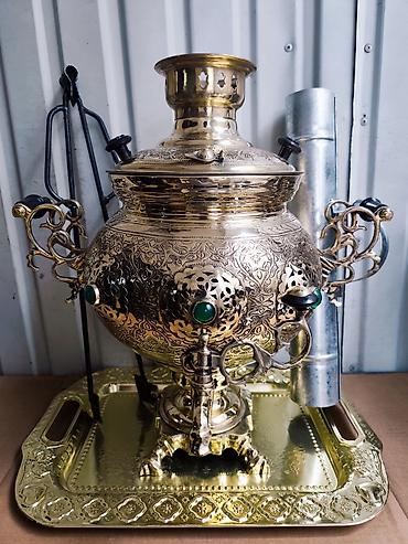 🏆 Илгерки жез Хан самоору. 🌊 Көлөмү: 10 литр. 🪙 Материалы: Жез (латунь), никелденген. 🏭 Өндүрүш: Б. Л. Ванников атындагы "Штамп" машина куруу заводу, Тула шаары, СССР. 🎖️ Чыккан жылы: 1950 - жж. 🪵 ...