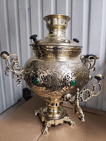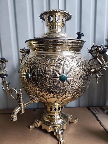 🏆 Илгерки жез Хан самоору. 🌊 Көлөмү: 7 литр. 🪙 Материалы: Жез (латунь). 🏭 Өндүрүш: Б. Л. Ванников атындагы "Штамп" машина куруу заводу, Тула шаары, СССР. 🎖️ Чыккан жылы: 1970 - жж. 🪵 Иштеши: Отун, ...