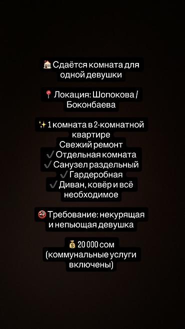 Сдается комната для одной девушки. Локация: Шопокова / Боконбаева