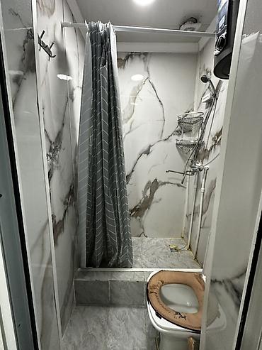 - Санузел: душевой уголок с шторкой, унитаз, пол и стены выложены плиткой, полка-органайзер для душа, водонагреватель/смеситель, вытяжка.