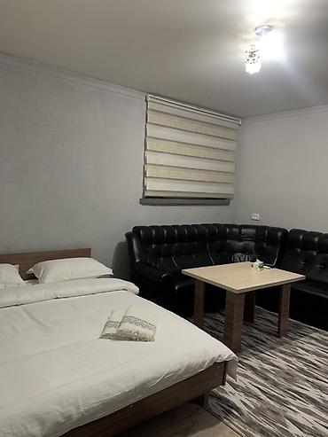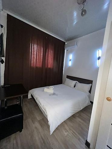 - Варианты планировок: номер с большой кроватью и прикроватными тумбами; номер-студия с кроватью, угловым кожаным диваном и журнальным столом; компактный номер с рабочим столом/стулом.