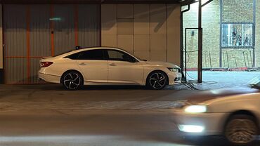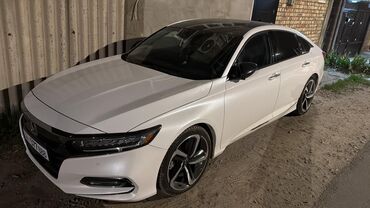 Honda Accord, белый седан бизнес‑класса с черной крышей (панорамный эффект). Современный дизайн: узкая светодиодная оптика, агрессивный передний бампер, широкая хромированная полоса на решетке. Аэродинамичный профиль, чистые линии кузова, изящный спойлер на крышке багажника.