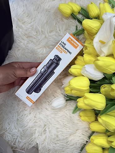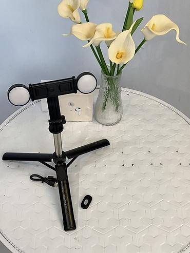 - Комплектация по фото: штатив с держателем и двумя LED, Bluetooth-пульт, зарядный кабель, фирменная коробка