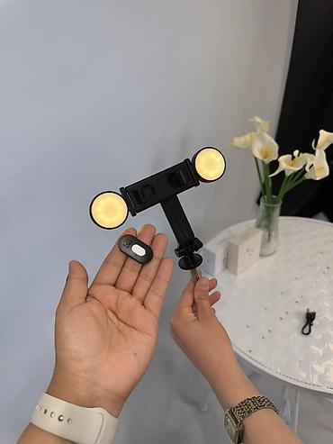 - Освещение: две круглые LED-лампы по бокам держателя для ровного фронтального света; тёплая подсветка, равномерное освещение лица и предметов