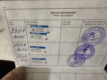- Вакцинация: Nobivac DHPPi — отметки и серии в паспорте от 28.07.2025, 19.08.2025 и 02.09.2025 с печатями врача.