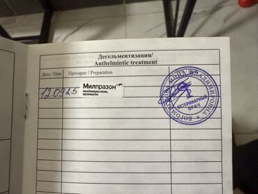 - Обработки: дегельминтизация препаратом Милправет (Мильпразон) — отметка от 12.09.2025.