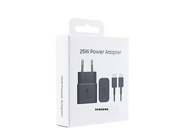 - На упаковке: «25W Power Adapter», бренд Samsung, изображение адаптера и кабеля USB‑C↔USB‑C.
