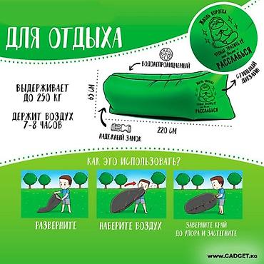 Воздух в это надувное приспособление наполняется самостоятельно, и каких-либо навыков и инструментов для установки не требуется. Причем при наличии небольшого ветерка мешок и вовсе не придется трясти – Шезлонг надуется сам. В сложенном виде не занимает много места и практически ничего не весит. Зато, когда необходимо, вы всегда надуете его за несколько секунд.