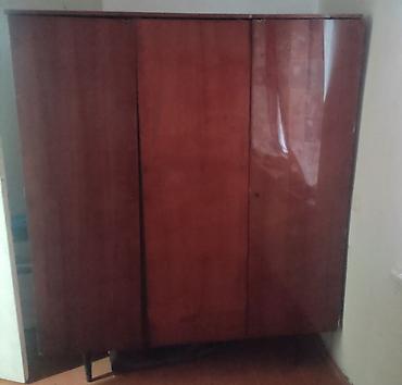 Шкаф трёхстворчатый, классический, из дерева с глянцевым шпоном тёплого коричневого оттенка. Стоит на высоких опорах, что упрощает уборку под ним.