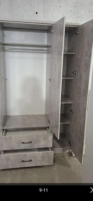- Материалы и отделка: ЛДСП с современными декорами — светло‑серый/бетон и белый «мрамор/камень». Кромка в цвет. Устойчивые к истиранию поверхности, лёгкий уход.