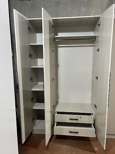 - Центрально-правая секция: штанга для вешалок + верхняя полка для коробок/головных уборов.
