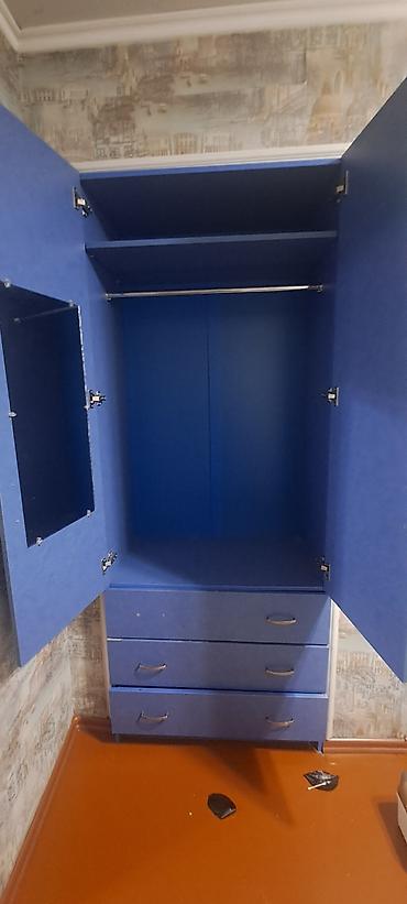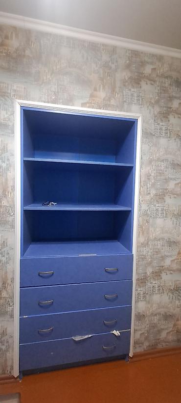 Синий гардеробный шкаф с открытыми полками и выдвижными ящиками