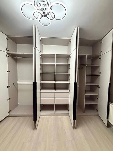 - Продуманная внутренняя организация: секции с штангами для короткой и длинной одежды, блоки с полками разной высоты, выдвижные ящики, антресоли во всю высоту, открытые ниши.
