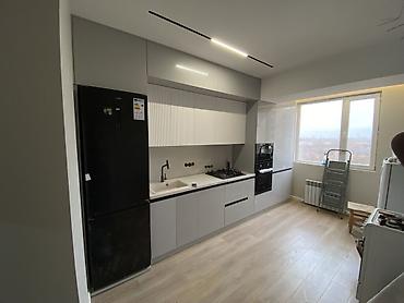 - Современный минималистичный дизайн: ровные фасады без филёнок, скрытая фурнитура, длинные вертикальные ручки в черном цвете.