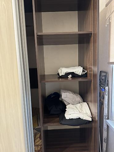 - Правая секция: высокий стеллаж с несколькими полками для одежды и аксессуаров.
