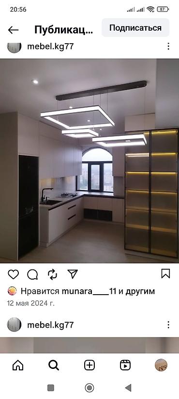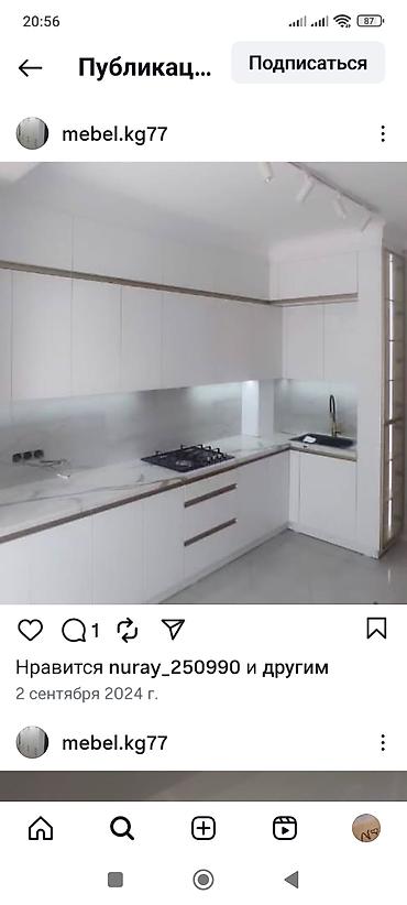 - Современные кухни под размер помещения: линейные и Г‑образные планировки, встроенная техника, мойка под столешницей, скрытые ручки/профиль Gola, сочетание закрытых секций и витрин с теплой подсветкой.