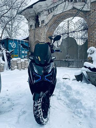Скутер/мопед спортивного стиля, черный, с агрессивной «икс»-образной LED-оптикой и светодиодными поворотниками. Передняя часть с высоким затемненным ветровиком, зеркала на длинных кронштейнах. Диск...