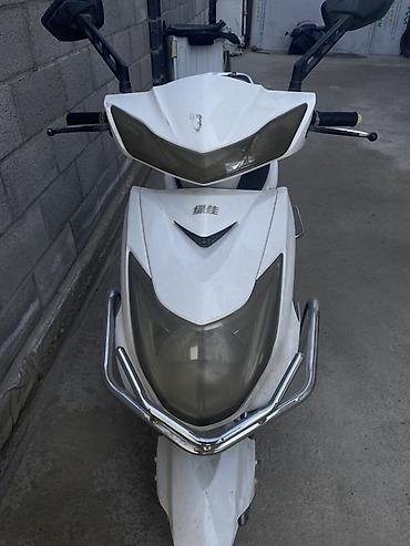 Скутер/электрический типа, белый, с расширенным комплектом защиты и багажом. Состояние как на фото запас хода 60 70км скорость до 65 гоняется задние передачи тоже есть