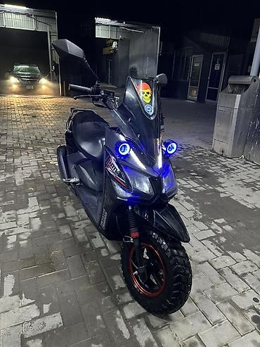 Скутер 50-125 см³ (визуально классический городской/кросс-вариант) - Спортивный дизайн кузова: острые линии пластика, ветровое стекло, светодиодная оптика спереди. - Колёса с внедорожным протектор...