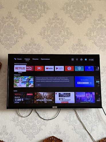 Смарт‑телевизор TCL в отличном состоянии, диагональ 43. Узкие рамки, настенное крепление VESA. Управление на Android TV/Google TV: на экране доступны Netflix, YouTube, Google Play, TCL Channel, браузер и другие приложения. Есть встроенный Wi‑Fi и поддержка потоковых сервисов, голосовой поиск/Ассистент (иконки микрофона и настроек на панели). Качество изображения — LED‑панель с насыщенными цветами и широкими углами обзора, подходит для мультфильмов, сериалов и фильмов. На корпусе расположены основные разъёмы (HDMI/USB — по интерфейсу Android TV распознаются внешние источники). Пульт с центральной кнопкой навигации. Отлично вписывается в интерьер при настенном монтаже.