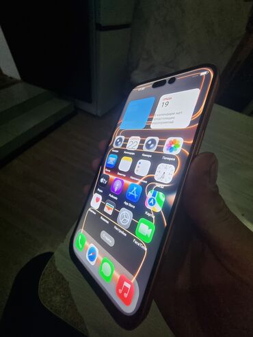 - Экран с тонкими рамками, отображение интерфейса iOS на русском языке: виджеты, App Store, FaceTime, Сообщения, Карты и др.