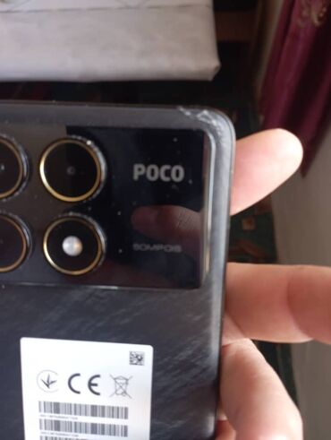 - Фирменный дизайн POCO: крупный модуль камер, текстурированная задняя панель тёмного цвета.