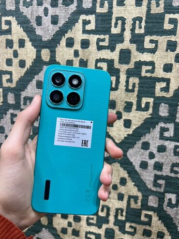 Смартфон с большим безрамочным дисплеем и вырезом под фронтальную камеру в верхней части экрана. Корпус в ярком бирюзовом цвете, текстурированная задняя крышка. Блок основной камеры — квадратный, с четырьмя круглыми модулями и вспышкой. На задней панели есть наклейка с IMEI и маркировкой EAC, а также нижний прорезь динамика.