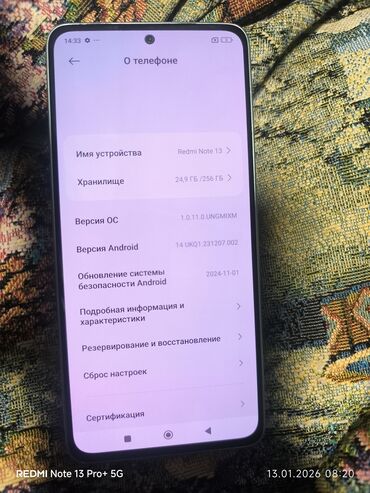 Экран с центральным вырезом под фронтальную камеру. Интерфейс MIUI/HyperOS с разделом «О телефоне», где видно модель Redmi Note 13 и указанные версии ПО.