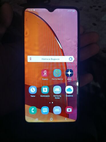 - Экран с вырезом под фронтальную камеру (Infinity‑V), диагональ около 6.4", тонкие рамки. На дисплее видны рабочие ярлыки Яндекс, Почта Mail.ru, Дзен, Samsung Notes, OneDrive, Часы, Календарь.