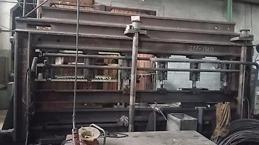Дополнительно на фото: мощный многопозиционный прессовый/штамповый агрегат рамной конструкции с четырьмя колоннами и несколькими рабочими головами — для операций прессования/штамповки листового или профильного металла с установкой оснастки на стол.