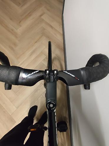- Руль: шоссейный «баран» с обмоткой, интегрированы заглушки Zipp, на верхах установлены дополнительные шоссейные грипсы/аэропэды Zipp (вид сверху).