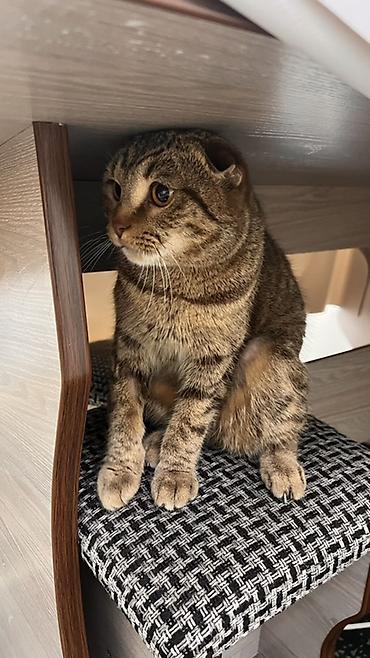 Шотландская вислоухая кошка, окрас коричневый табби. Компактная, с характерными аккуратно прижатыми ушками и крупными выразительными глазами. Шерсть короткая, плотная и мягкая, с чётким полосатым рисунком. Лапы мощные и аккуратные, хвост пушистый. Спокойный темперамент: любит укромные места и мягкие поверхности, быстро привыкает к дому, деликатная и ласковая. Идеальна для квартиры: не шумная, аккуратная, хорошо уживается с людьми. Отлично подходит для семей, ценящих нежный характер и милую внешность шотландцев. Имя на фото: Мишель.