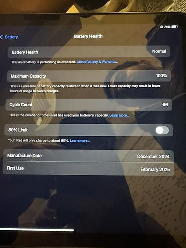 - Аккумулятор iPad: максимальная ёмкость 100%, количество циклов 66