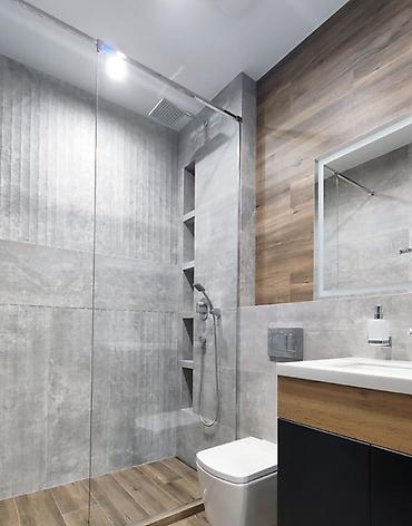 - Напольная и настенная керамогранитная плитка: фактура бетона и древесные декоры, влагостойкие затирки
