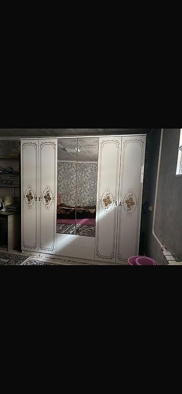 - Шкаф 6‑дверный с зеркальными центральными створками. Внешний декор — фигурные пилястры и цветочные орнаменты, ручки в тон. Просторное внутреннее наполнение (секции для вешалок и полки).