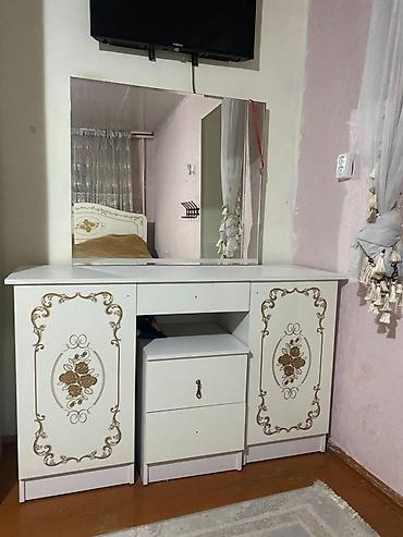 - Туалетный стол с большим настольным зеркалом. Две закрытые тумбы по бокам, центральная открытая ниша и выдвижные ящики.