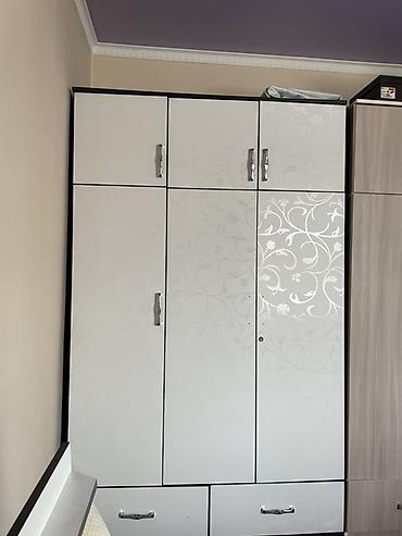 - Вместительный платяной шкаф с распашными дверями и нижними ящиками. Фасады белые с глянцевым растительным узором, фурнитура под металл.
