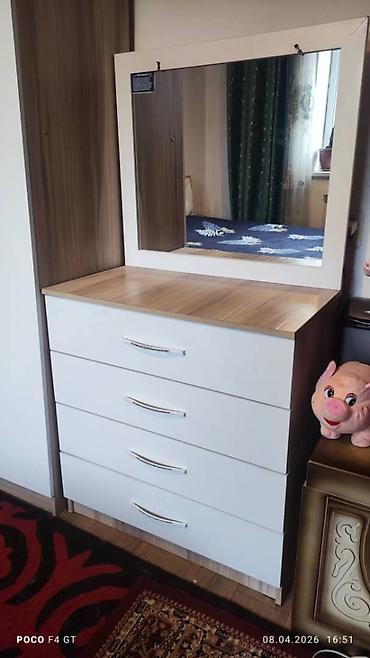 - Комод с зеркалом/туалетный столик: несколько выдвижных ящиков, широкая столешница под дерево, большое настенное зеркало в белой раме.
