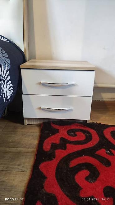 - Две прикроватные тумбы: по 2 выдвижных ящика каждая, фасады белые, столешница под светлое дерево, металлические ручки.