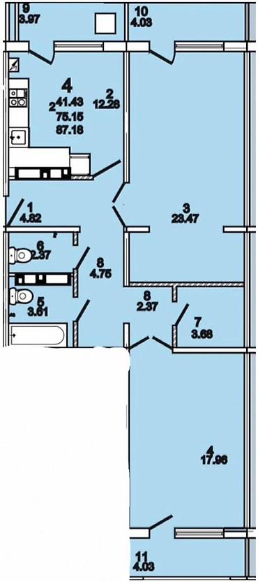 2 комнаты, 88 м², 107 серия, 3 этаж, Готовая ПСО (под самоотделку)