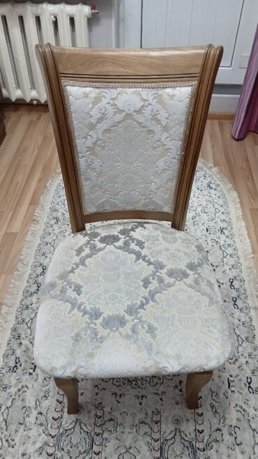 - Стулья с мягким сиденьем и спинкой, обиты жаккардовой тканью с классическим узором; каркас из дерева.