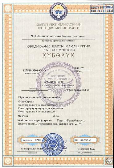 Лицензия: серия КРП-1-2 № 06117 от 12.03.2015, выдана Государственным агентством архитектуры, строительства и ЖКХ при Правительстве КР. Территория действия: Кыргызская Республика. Срок действия: без ограничения. ИНН/идентификационный код: 00.