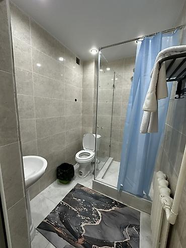 - Санузел совмещённый: душевая кабина со шторой, унитаз, раковина, зеркало, полотенцедержатели.