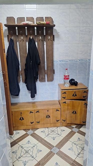 - Прихожая с настенной деревянной вешалкой, полкой и тумбами для хранения.