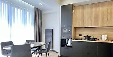 - Кухня‑столовая с панорамным остеклением и плотными шторами: встроенный гарнитур с верхними фасадами под светлое дерево и нижними матовыми темными, рабочая подсветка.