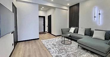 - Просторная гостиная с большим модульным угловым диваном, журнальным столиком и настенным ТВ. Акцентная ритмичная рейка и декоративные настенные светильники.