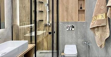 - Черная фурнитура, скрытые карнизы, нейтральная палитра серого и белого.