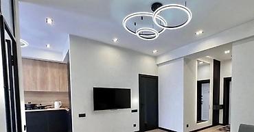 - Многоуровневое освещение: точечные споты, кольцевые потолочные светильники, декоративные бра.