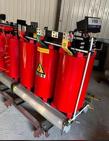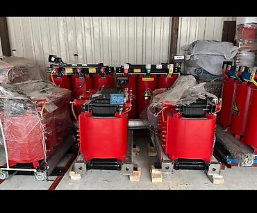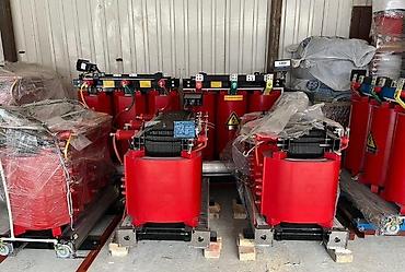 - Сухие трехфазные трансформаторы в литой изоляции (красные обмотки), открытое исполнение на тележке/основании. На части агрегатов установлены электронные блоки контроля температуры/вентиляции и шинные выводы с цветовой маркировкой фаз.